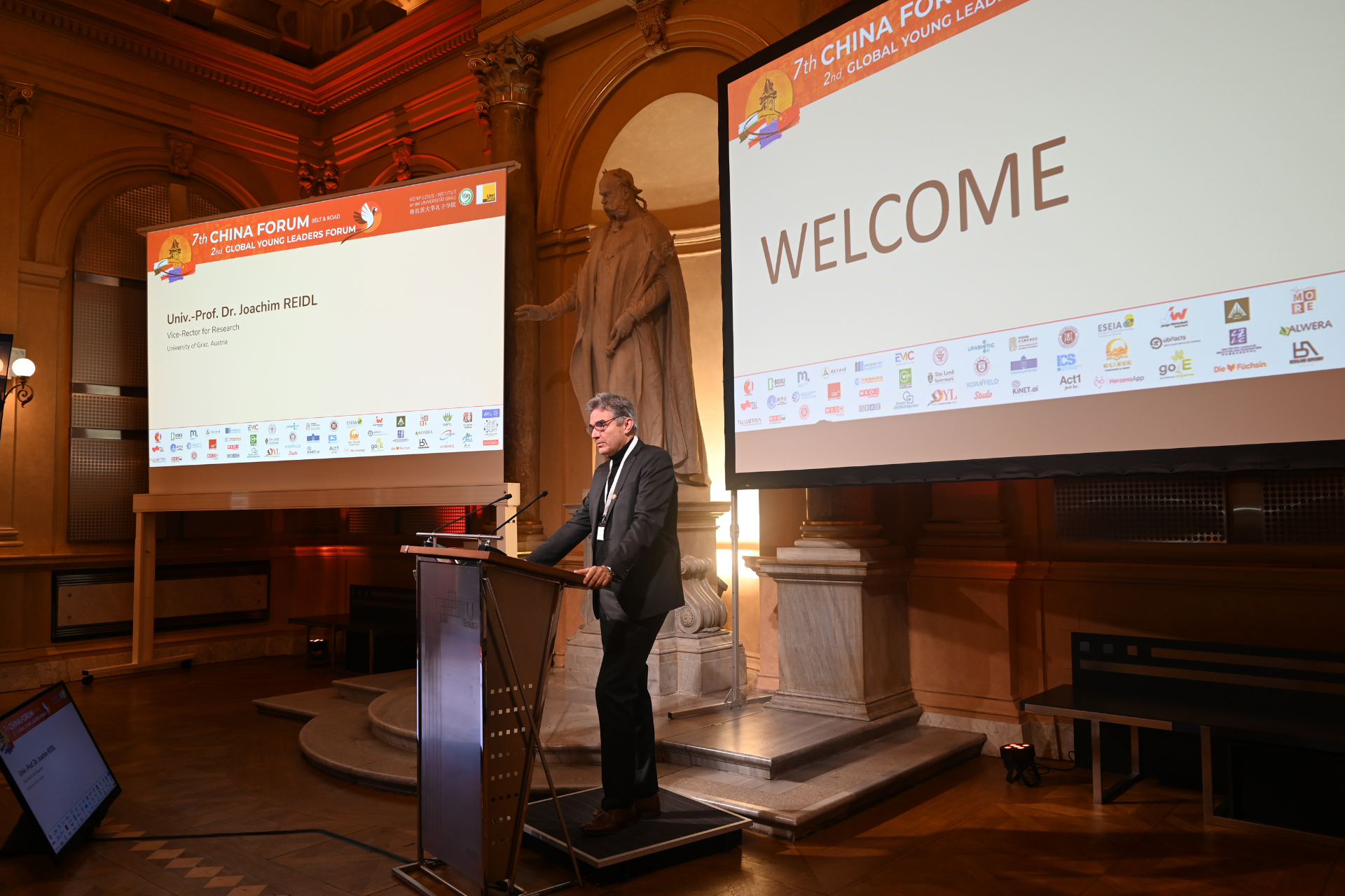 Vor Ort in der Technischen Universität Graz und vor den Bildschirmen im virtuellen Raum verfolgten die mehr als 250 Teilnehmer:innen richtungsweisende und multiperspektivische Vorträge der Referent:innen des 7. China-Forums & 2. Global Young Leaders-Forums.
